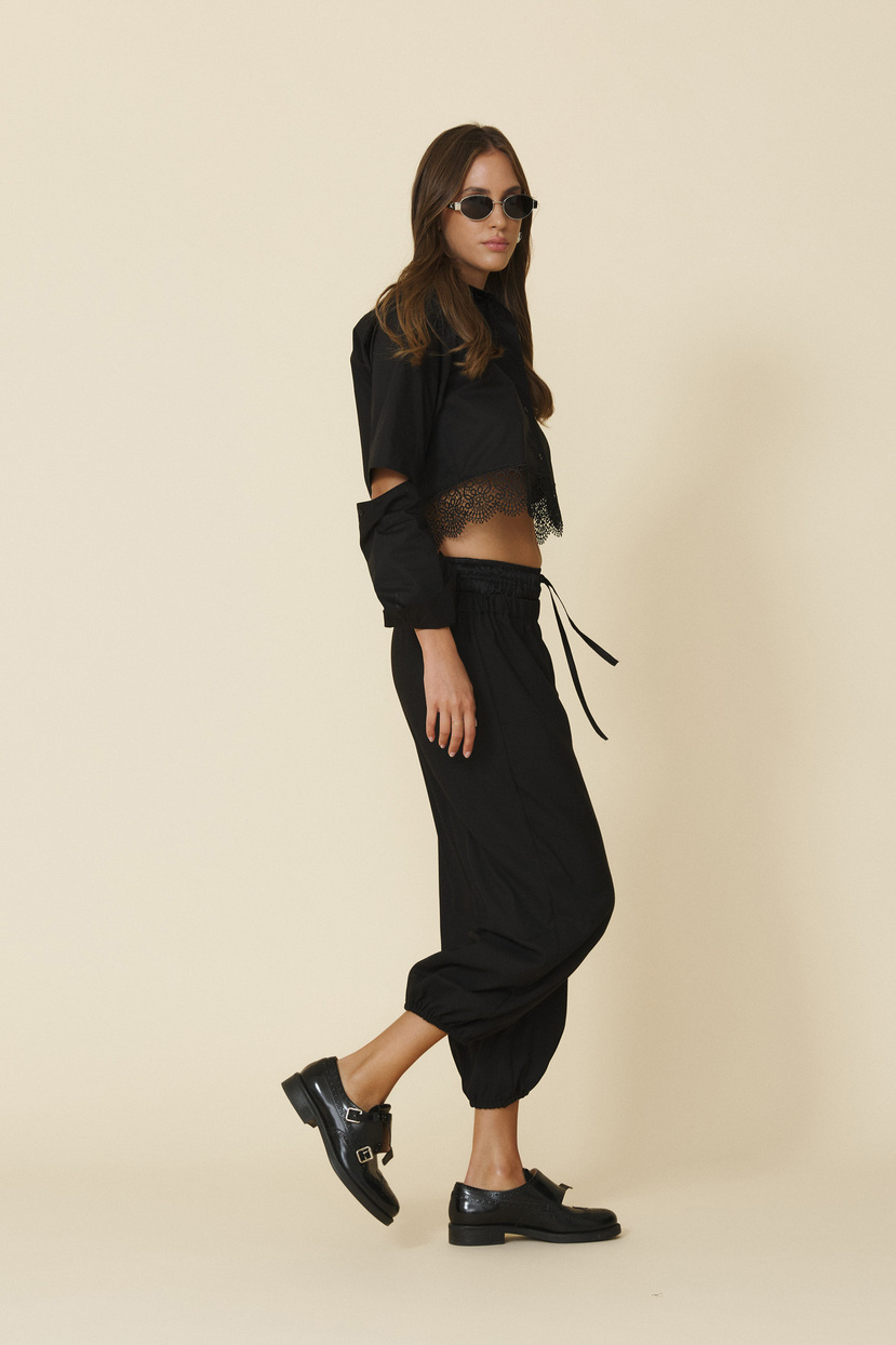 HOME - CLOTHING - Tops - Shirts-Black Cotton Cropped Shirt With Lace - FW25